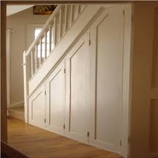 Even with plain white paint these useful under stair storages can be just as lovely and useful as any customized cabinets. The base cabinets are 30 deep and feature maple roll out trays behind the frame and panel doors led rope lighting accents the triangular bookcase above. The space under your stairs represents an extra storage space when you need one so even if you think you don t have anything to put on build some shelves and make use of the that space.